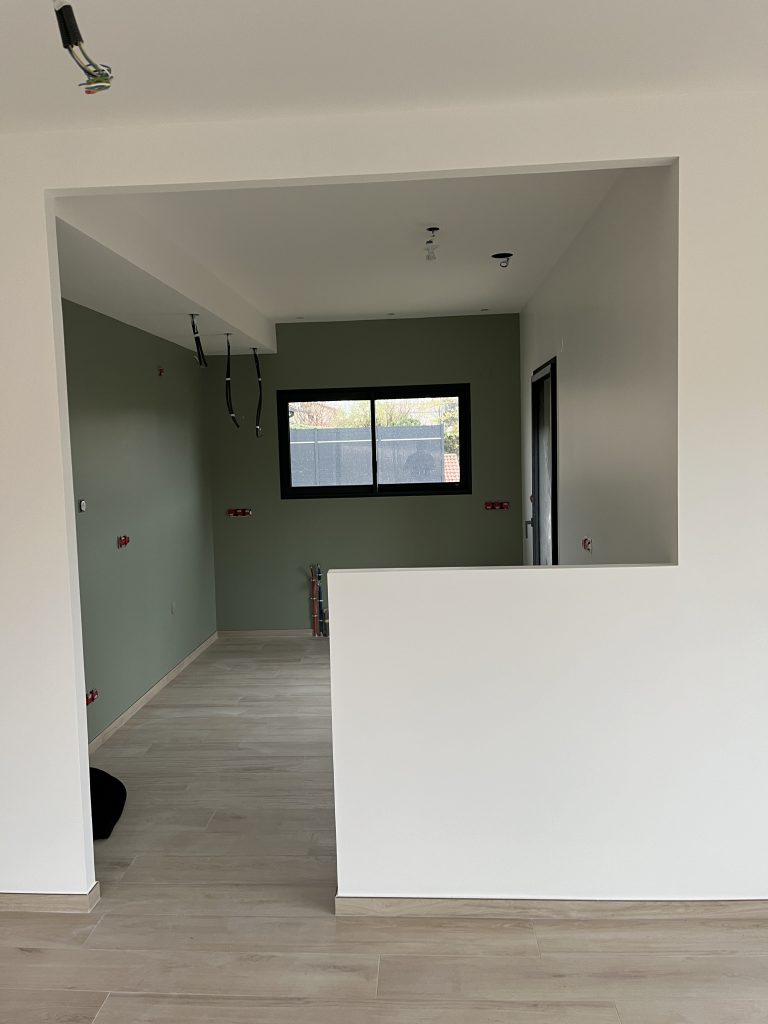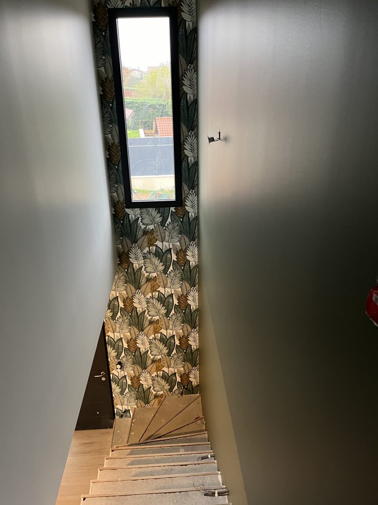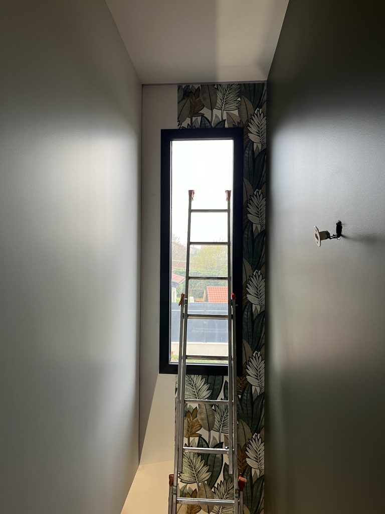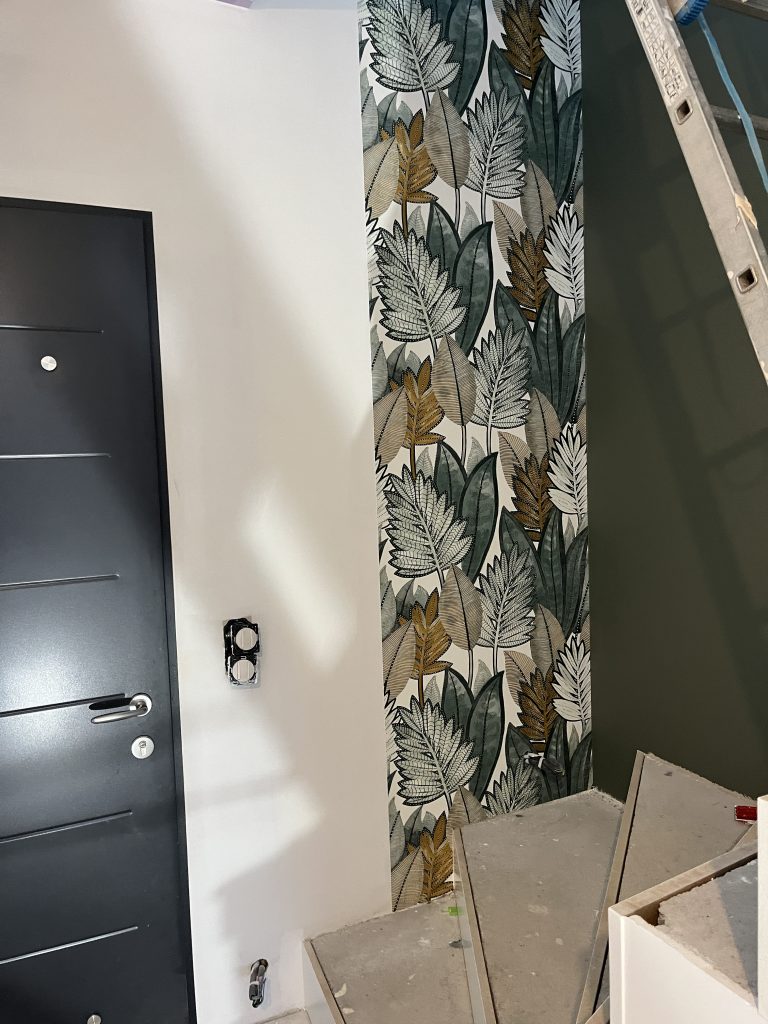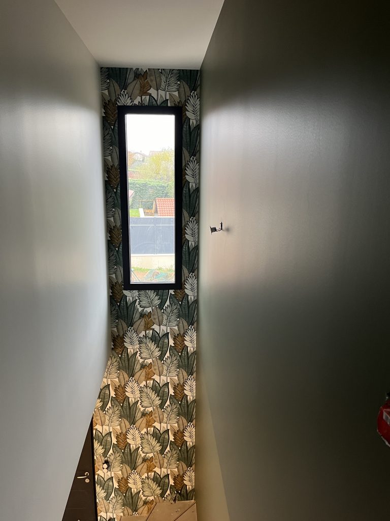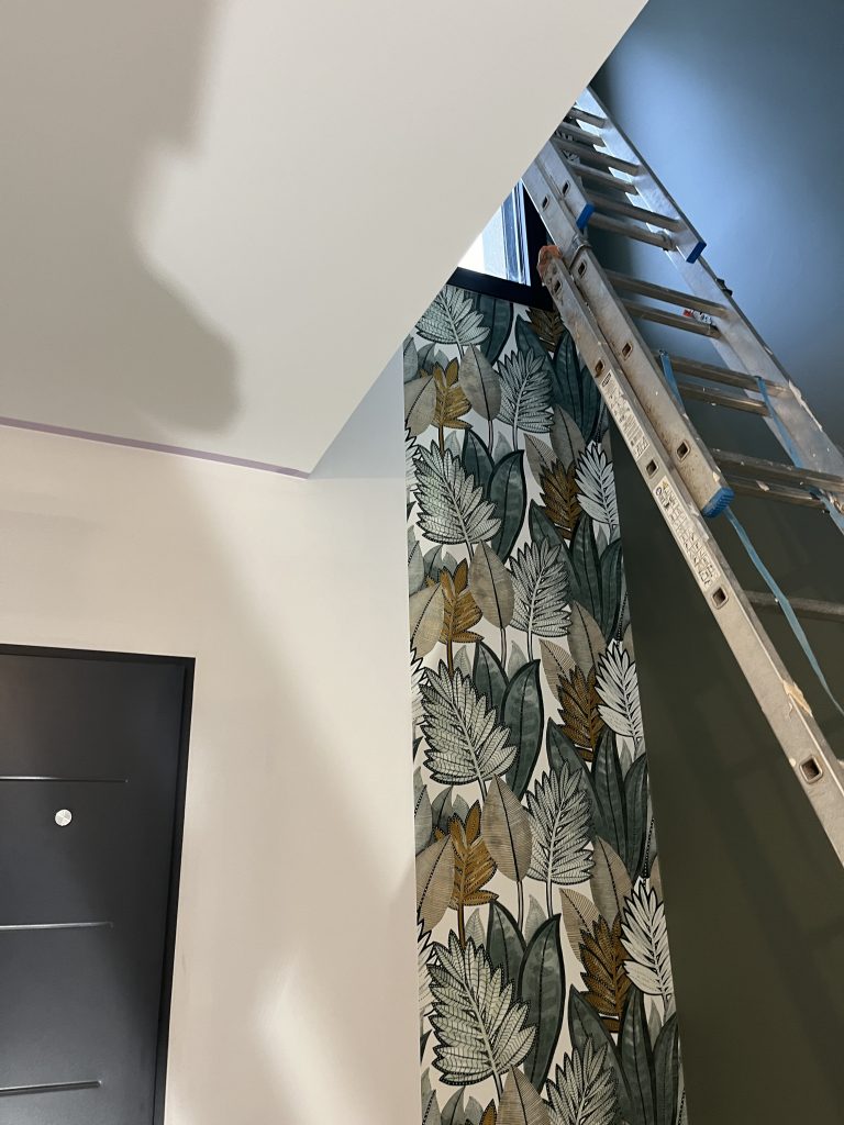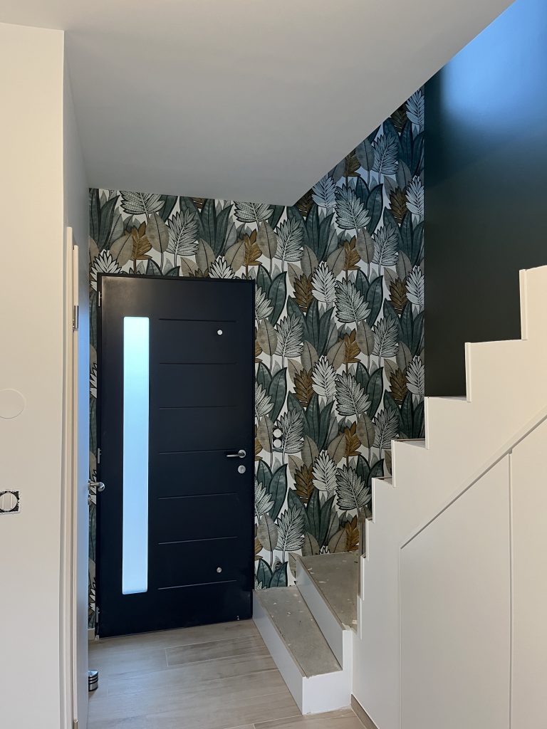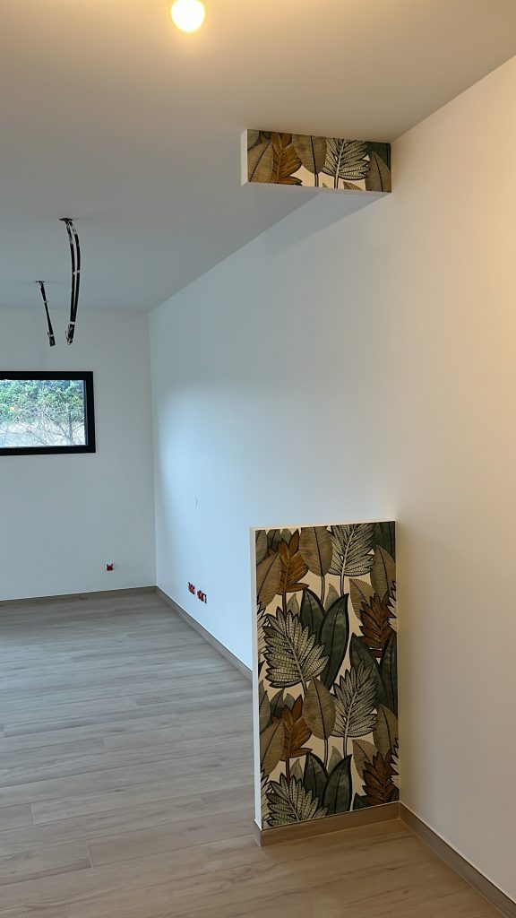 Dans cette nouvelle demeure, à notre suggestion, mon client a recommandé au constructeur de se limiter aux bandes à joint. Cette décision nous permet par la suite d’appliquer méticuleusement un enduit de finition sur les joints, assurant ainsi une qualité irréprochable, suivie d’un ponçage minutieux, d’une impression soignée et de deux couches de finition. Chez Piquas Deco, nous soulignons toujours l’importance, voire l’impératif, d’une finition minutieuse pour tous les projets réalisés par des constructeurs dans des résidences neuves. En poursuivant notre démarche, nous avons également réalisé une superbe pose de papier peint décoratif, accompagnée de l’application de teintes modernes sur certaines faces des murs, pour compléter harmonieusement l’esthétique globale de l’espace.
