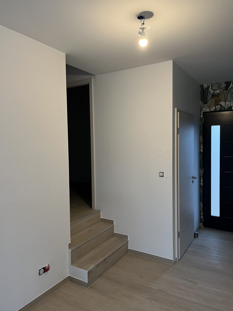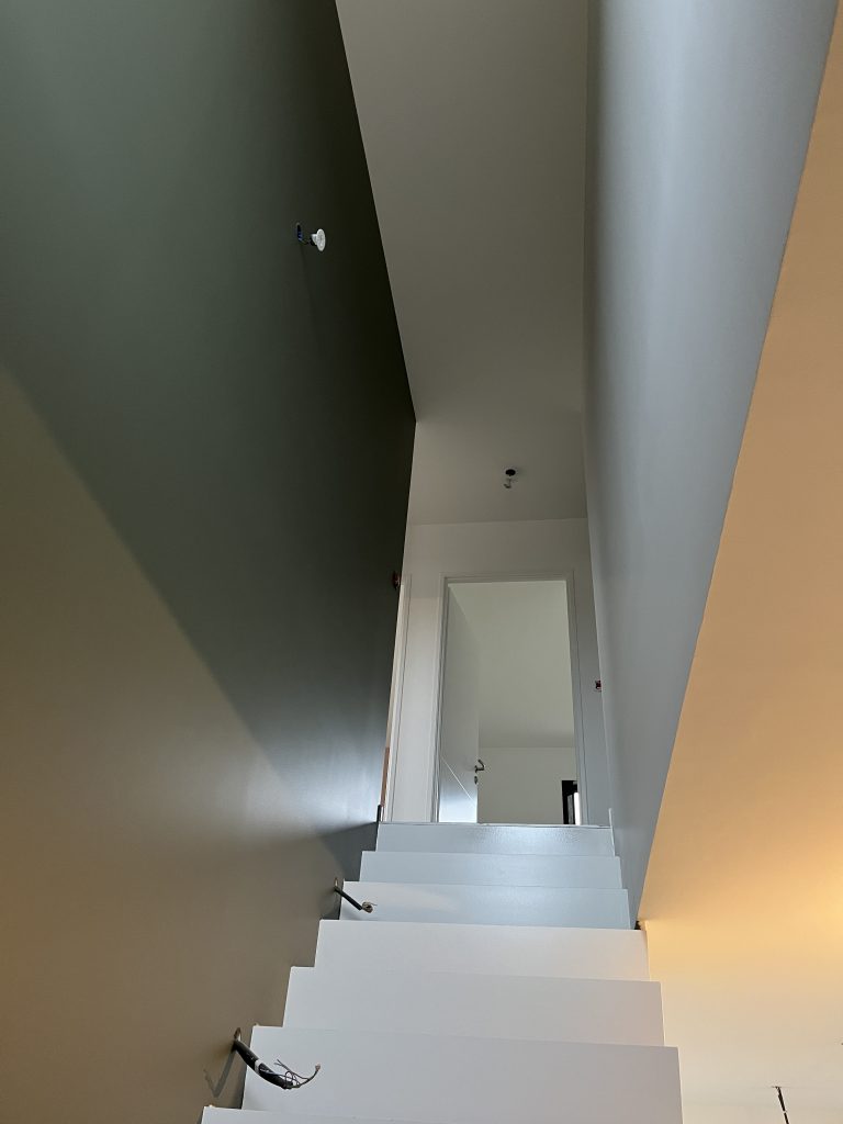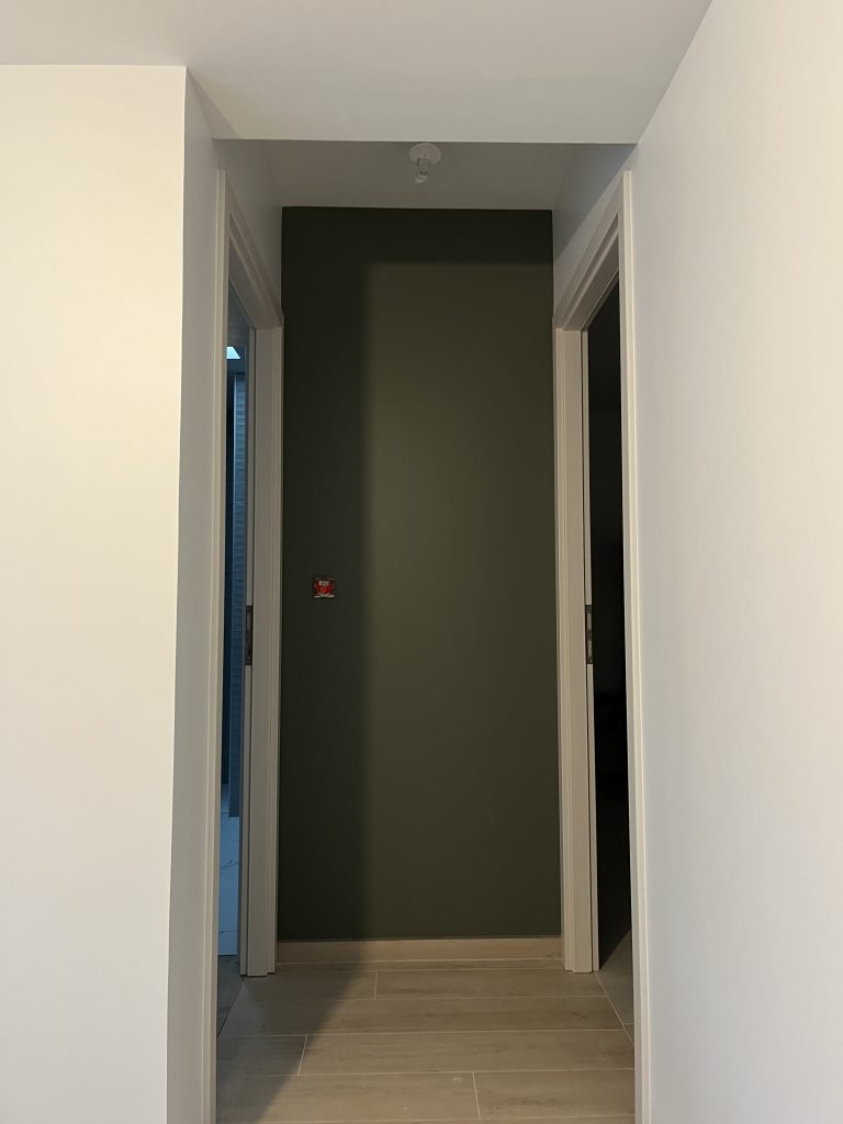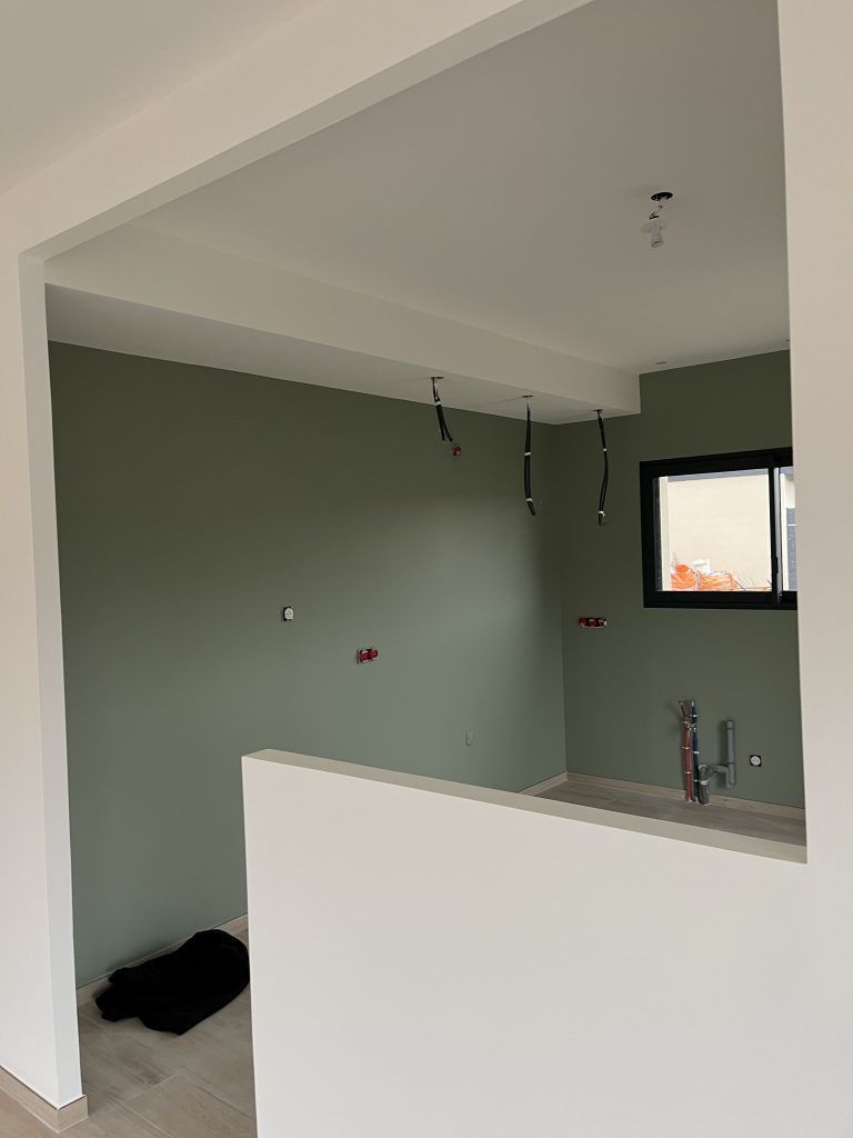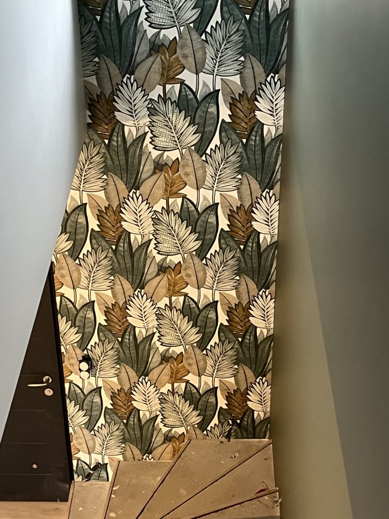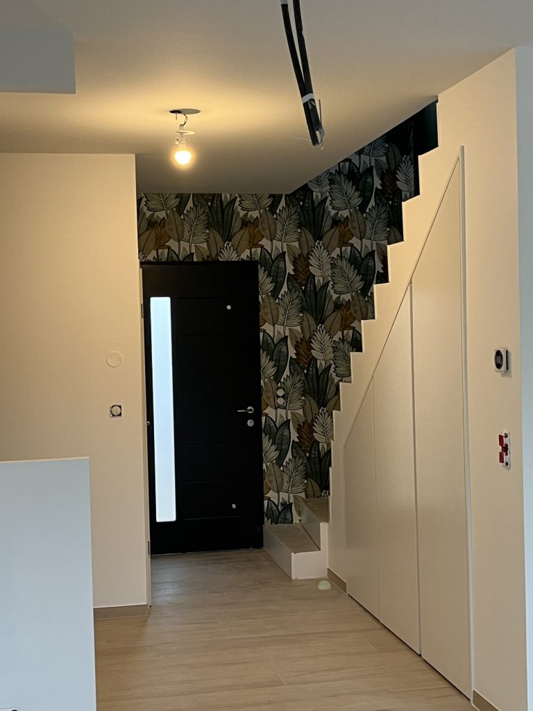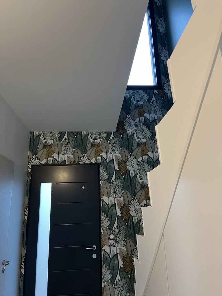 Dans cette nouvelle demeure, à notre suggestion, mon client a recommandé au constructeur de se limiter aux bandes à joint. Cette décision nous permet par la suite d’appliquer méticuleusement un enduit de finition sur les joints, assurant ainsi une qualité irréprochable, suivie d’un ponçage minutieux, d’une impression soignée et de deux couches de finition. Chez Piquas Deco, nous soulignons toujours l’importance, voire l’impératif, d’une finition minutieuse pour tous les projets réalisés par des constructeurs dans des résidences neuves. En poursuivant notre démarche, nous avons également réalisé une superbe pose de papier peint décoratif, accompagnée de l’application de teintes modernes sur certaines faces des murs, pour compléter harmonieusement l’esthétique globale de l’espace.