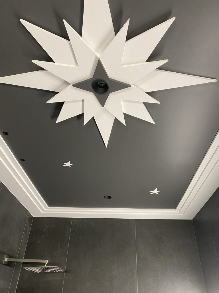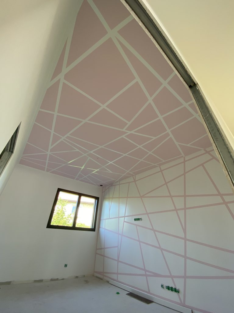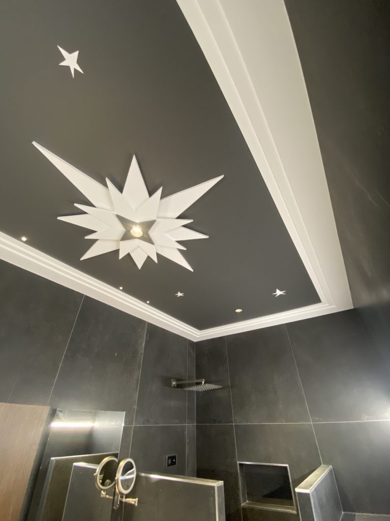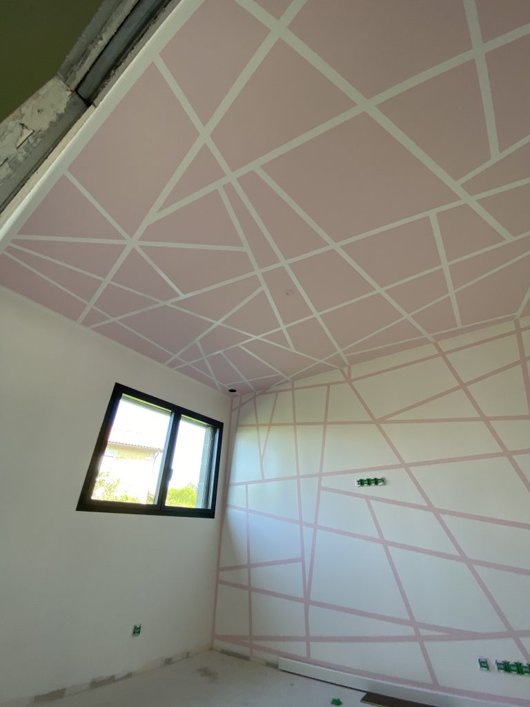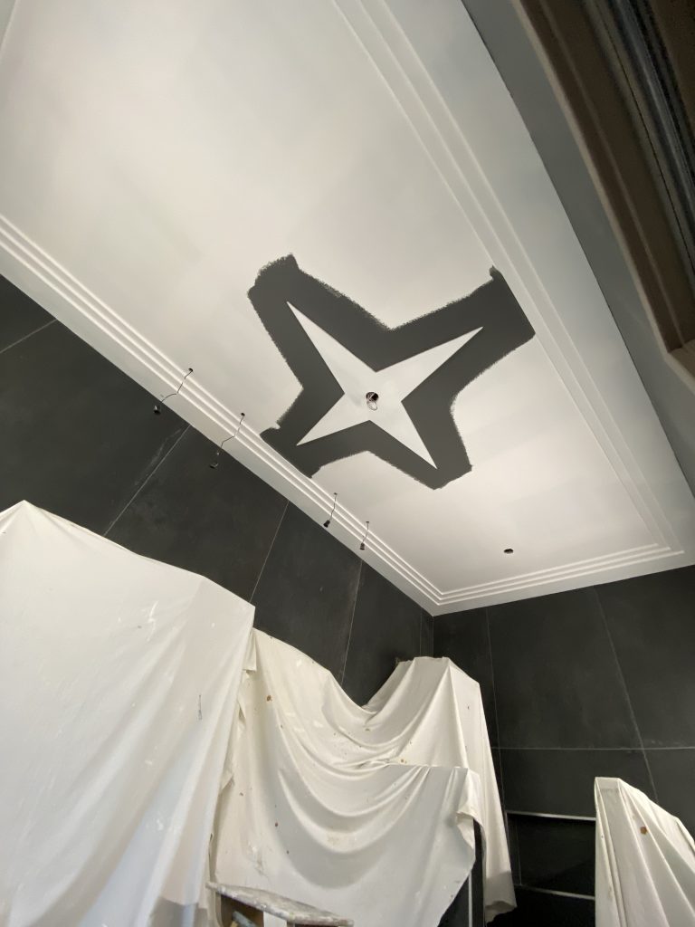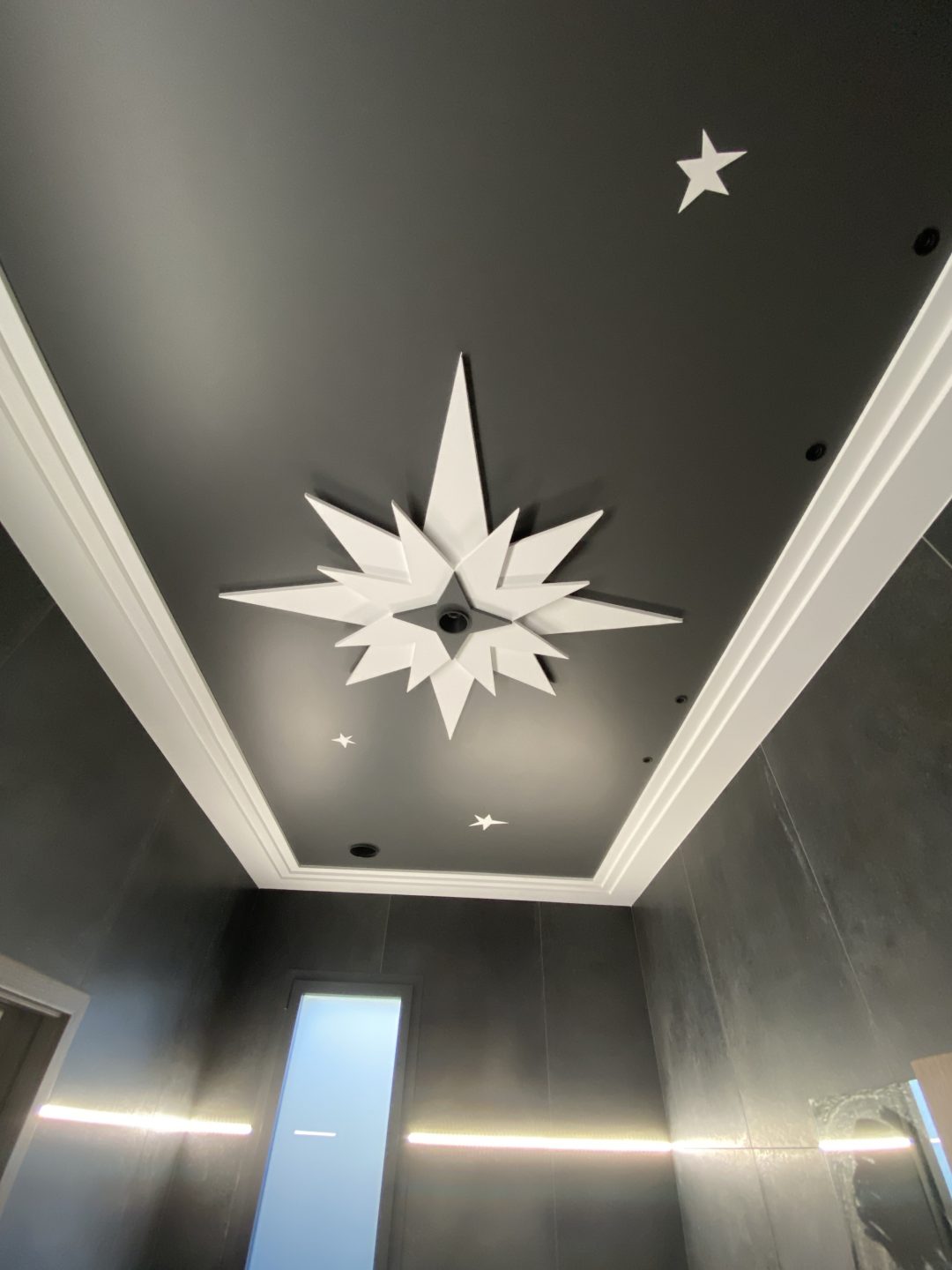 Découvrez deux peintures décoratives uniques : l’une ornant une tête de lit, l’autre embellissant un bureau dans une chambre d’ami. Jouant subtilement avec des jeux de brillance et de matité ainsi que des formes géométriques, ces créations apportent une touche d’élégance à leur environnement. Par ailleurs, admirez la splendide réalisation d’un plafond de salle de bain, agrémenté de corniches en placo, d’une décoration centrale étoilée à plusieurs niveaux également réalisée en placo, de spots intégrés et d’une peinture décorative. Les photos témoignent de l’embellissement remarquable de ces espaces.