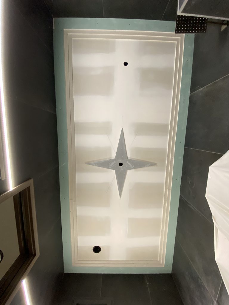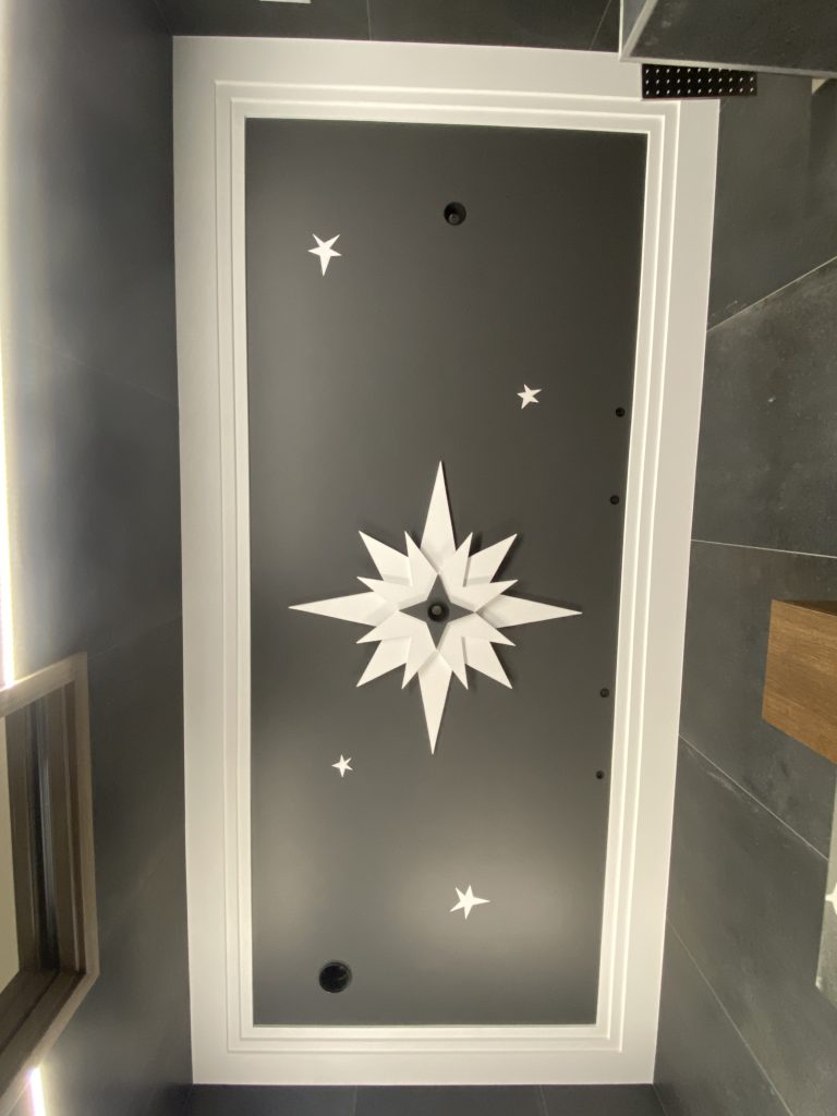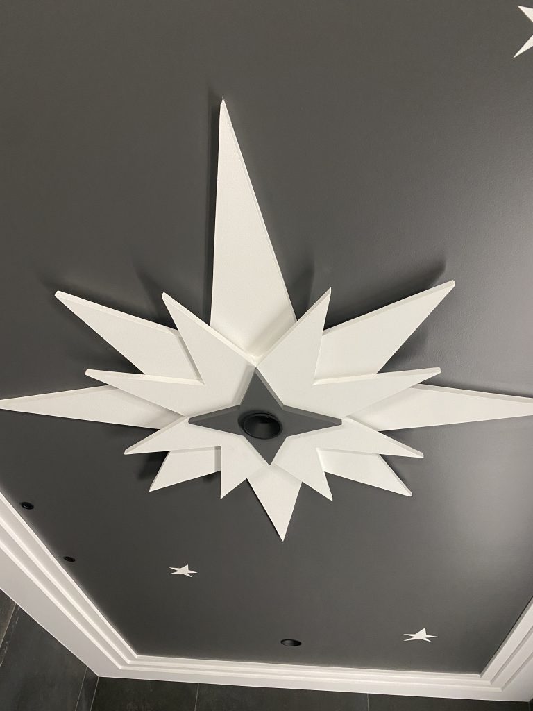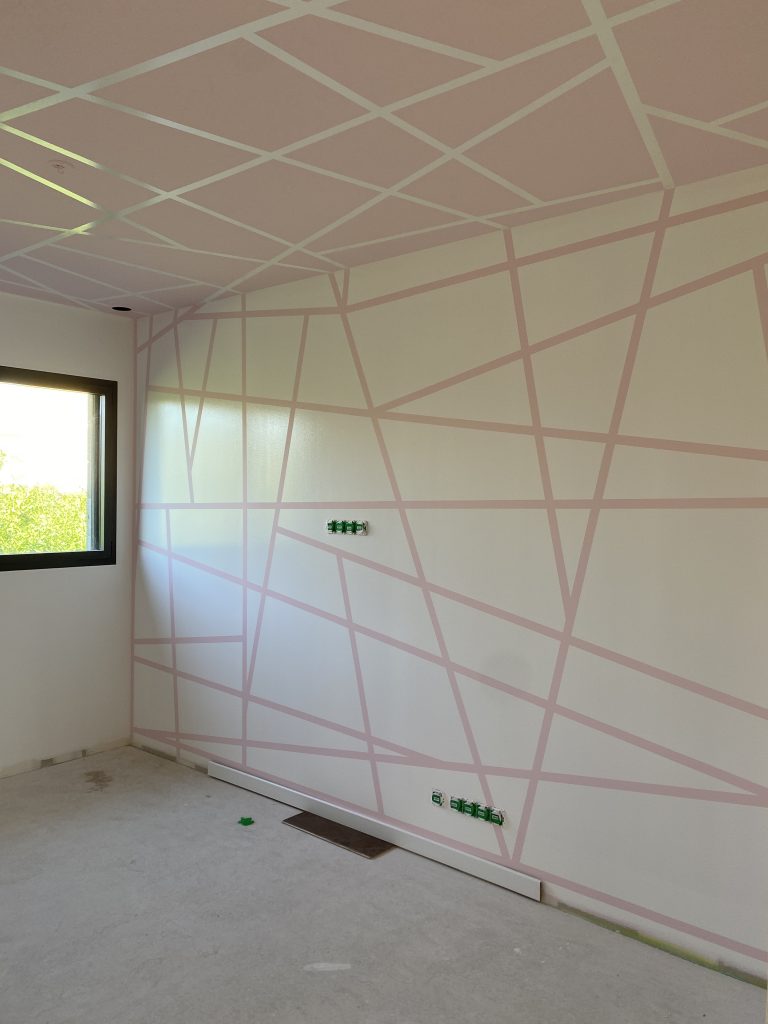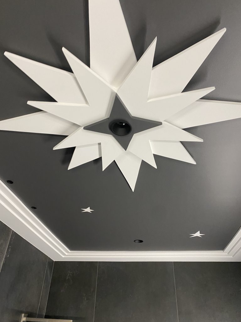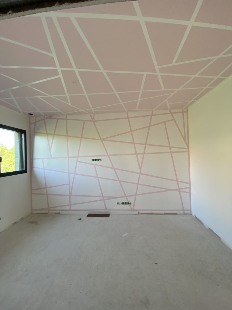 Découvrez deux peintures décoratives uniques : l’une ornant une tête de lit, l’autre embellissant un bureau dans une chambre d’ami. Jouant subtilement avec des jeux de brillance et de matité ainsi que des formes géométriques, ces créations apportent une touche d’élégance à leur environnement. Par ailleurs, admirez la splendide réalisation d’un plafond de salle de bain, agrémenté de corniches en placo, d’une décoration centrale étoilée à plusieurs niveaux également réalisée en placo, de spots intégrés et d’une peinture décorative. Les photos témoignent de l’embellissement remarquable de ces espaces.