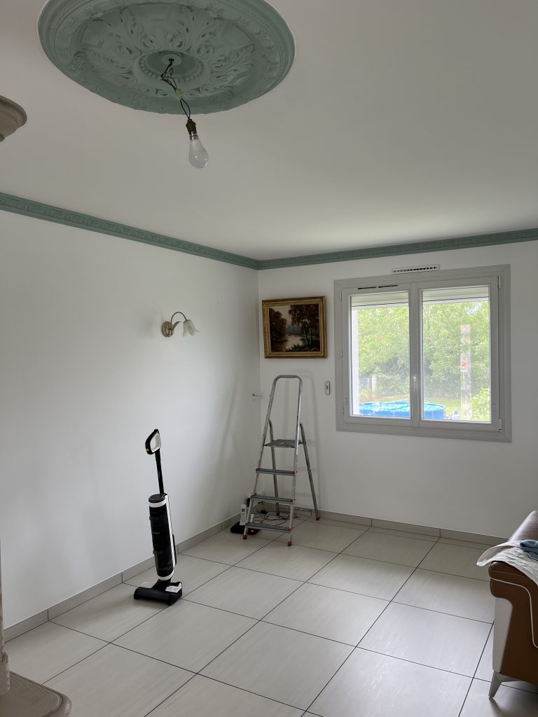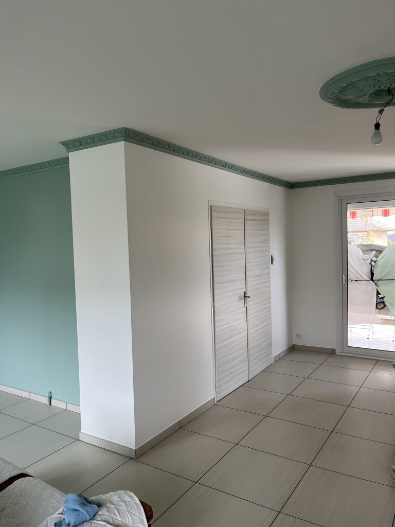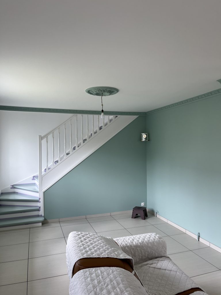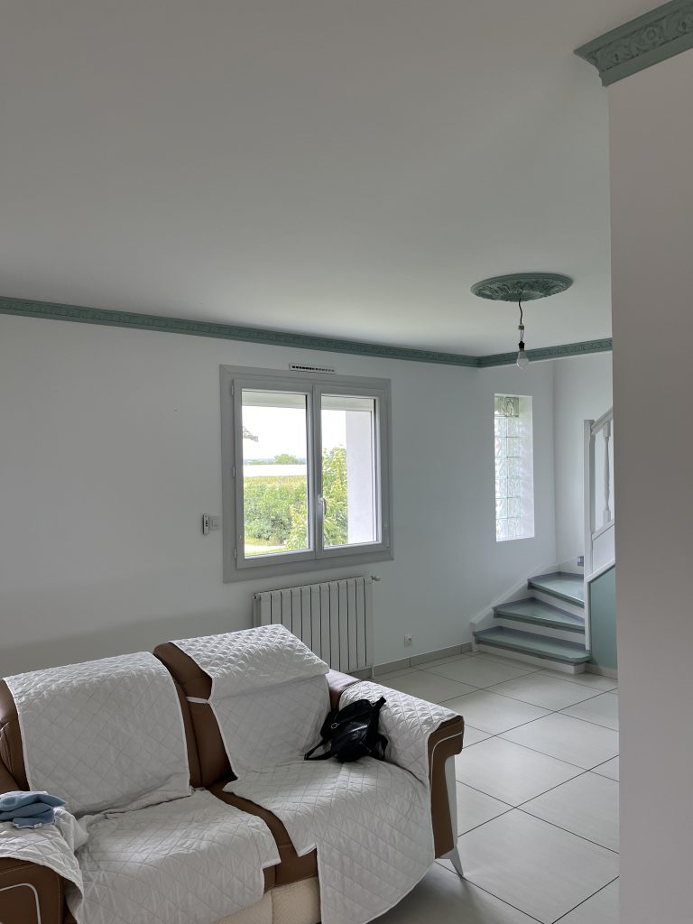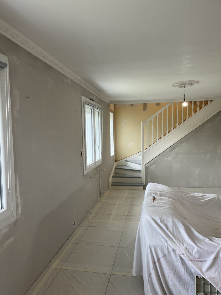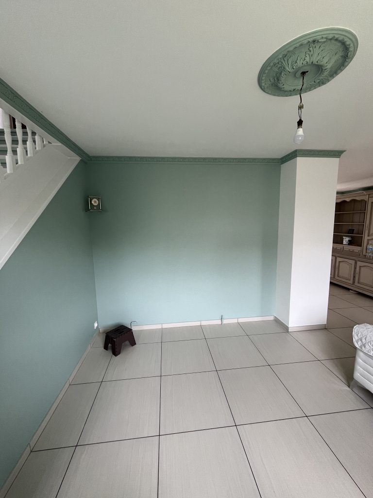 **Rénovation d’un Salon et Salle à Manger : Une Transformation Élégante** Nous avons récemment eu le plaisir de réaliser une belle rénovation dans un salon, une salle à manger et une petite montée d’escalier. Après que nos clients aient procédé à la dépose du papier peint, nous avons pris en main les travaux. Nous avons commencé par un masticage soigné au niveau du plafond, suivi d’un ratissage des murs en trois passes pour garantir une surface parfaitement lisse. Un ponçage méticuleux a ensuite été effectué avant l’application d’une couche d’impression, suivie de deux couches de finition pour un rendu impeccable. Concernant l’escalier, nous avons également effectué un ponçage minutieux, appliqué une couche d’impression, puis deux couches de peinture glycéro pour assurer durabilité et éclat. Pour sublimer cet espace, nous avons choisi une teinte harmonieuse pour les rosaces, les corniches, certaines faces de murs, ainsi que les marches de l’escalier, créant ainsi un joli rappel visuel. Découvrez les photos illustrant le déroulement de ces travaux, témoignant de la transformation réussie de cet espace de vie.