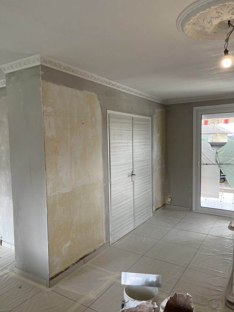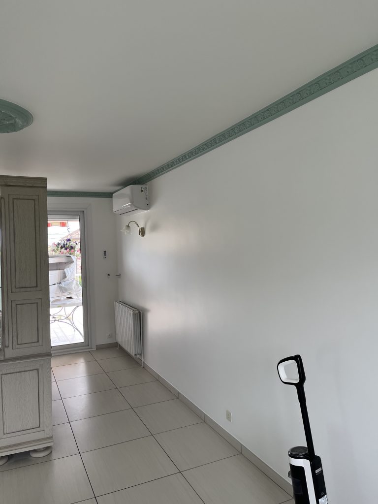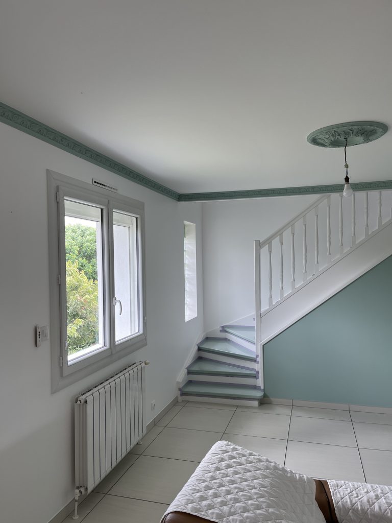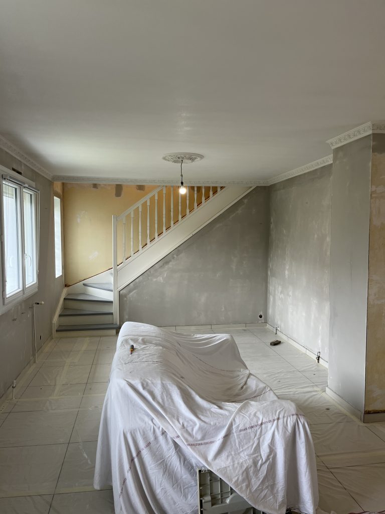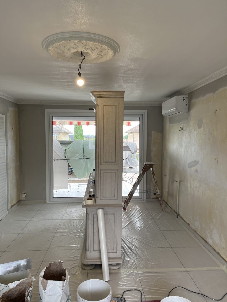 **Rénovation d’un Salon et Salle à Manger : Une Transformation Élégante** Nous avons récemment eu le plaisir de réaliser une belle rénovation dans un salon, une salle à manger et une petite montée d’escalier. Après que nos clients aient procédé à la dépose du papier peint, nous avons pris en main les travaux. Nous avons commencé par un masticage soigné au niveau du plafond, suivi d’un ratissage des murs en trois passes pour garantir une surface parfaitement lisse. Un ponçage méticuleux a ensuite été effectué avant l’application d’une couche d’impression, suivie de deux couches de finition pour un rendu impeccable. Concernant l’escalier, nous avons également effectué un ponçage minutieux, appliqué une couche d’impression, puis deux couches de peinture glycéro pour assurer durabilité et éclat. Pour sublimer cet espace, nous avons choisi une teinte harmonieuse pour les rosaces, les corniches, certaines faces de murs, ainsi que les marches de l’escalier, créant ainsi un joli rappel visuel. Découvrez les photos illustrant le déroulement de ces travaux, témoignant de la transformation réussie de cet espace de vie.