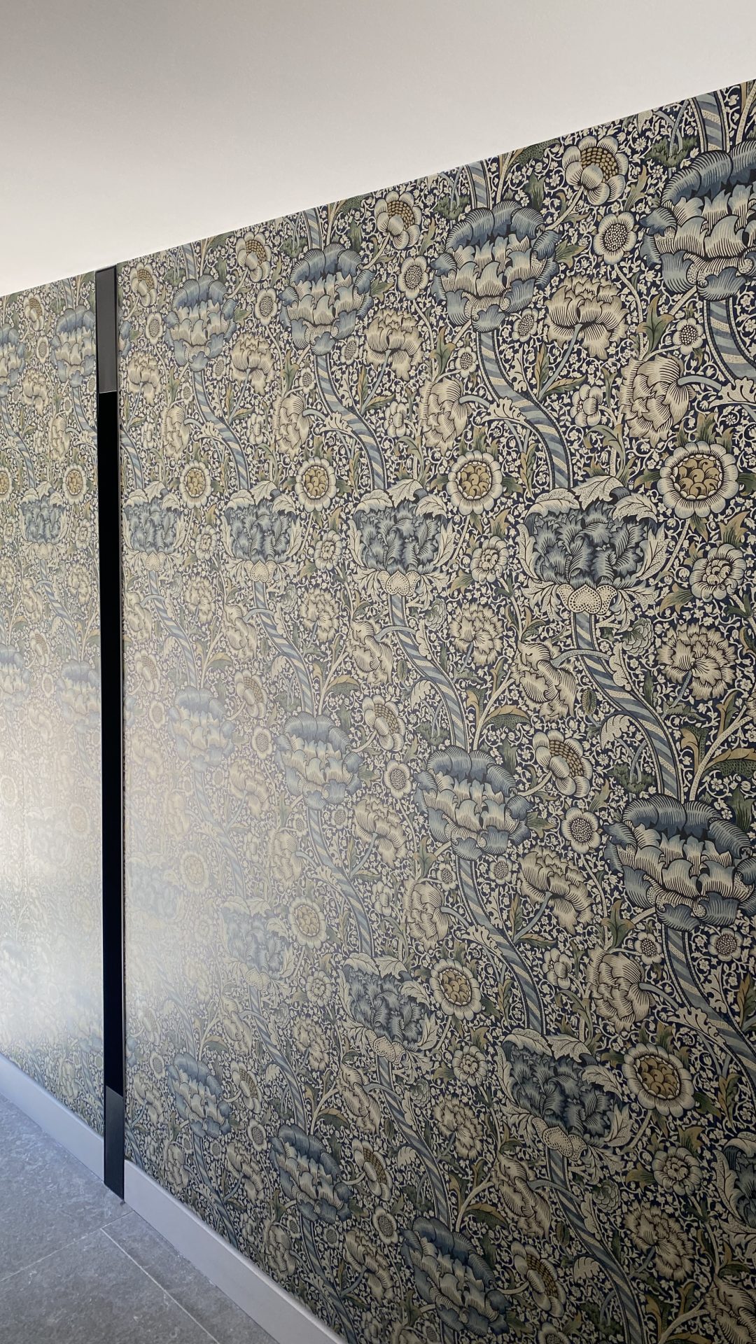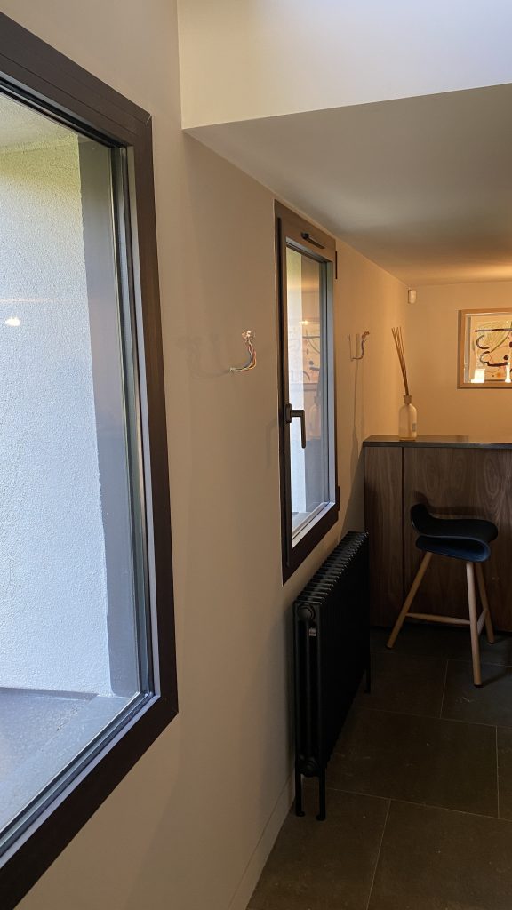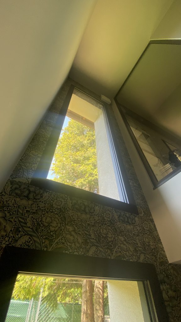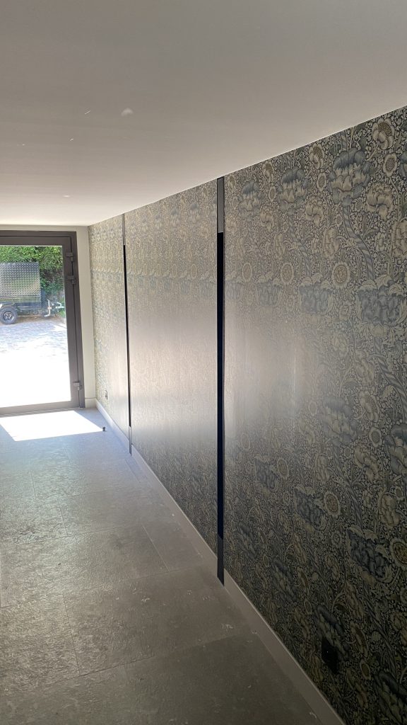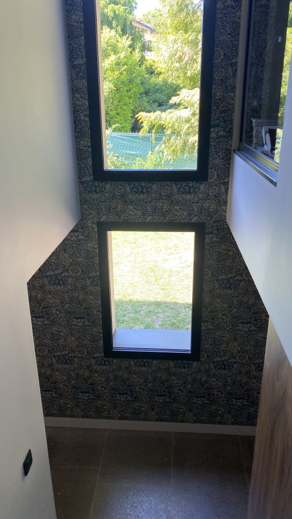Voici un magnifique papier peint vinyle décoratif qui orne le couloir d’entrée d’une superbe villa. Dans les photos avant-après, vous pouvez admirer la transformation : un mur d’entrée délimité par des colonnes lumineuses, une montée d’escalier vitrée s’élevant sur environ 5 mètres, et menant à un coin détente accueillant.