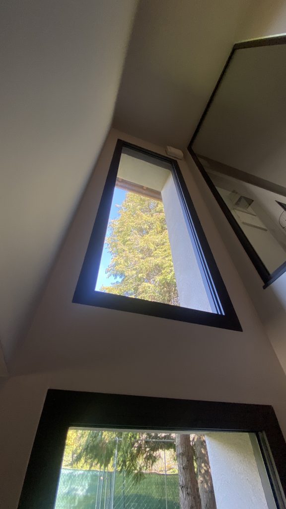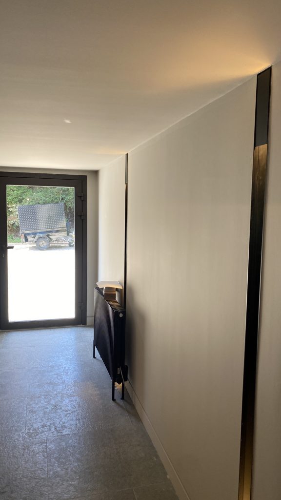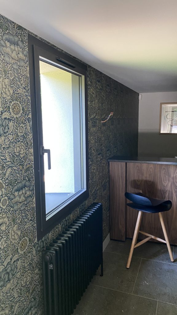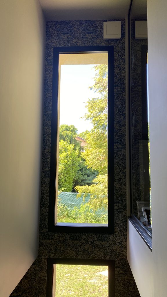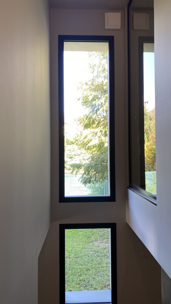 Voici un magnifique papier peint vinyle décoratif qui orne le couloir d’entrée d’une superbe villa. Dans les photos avant-après, vous pouvez admirer la transformation : un mur d’entrée délimité par des colonnes lumineuses, une montée d’escalier vitrée s’élevant sur environ 5 mètres, et menant à un coin détente accueillant.