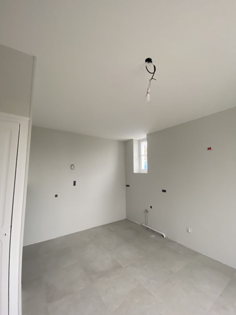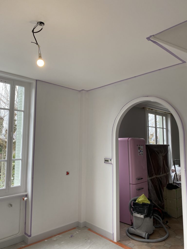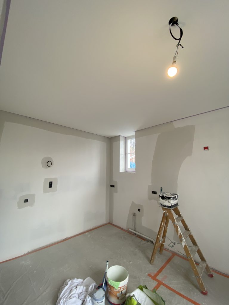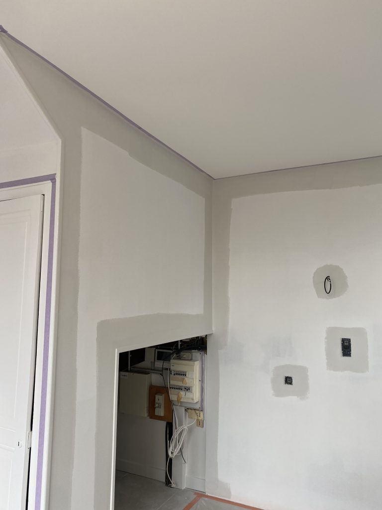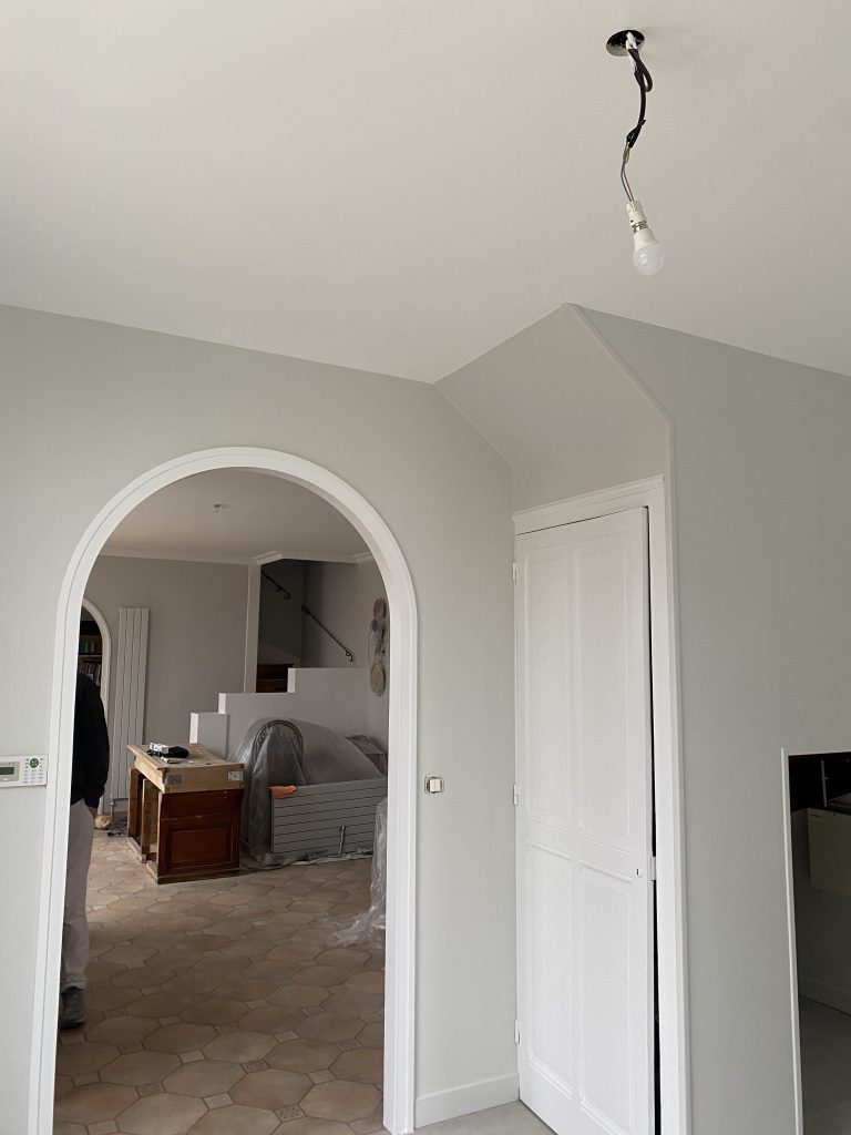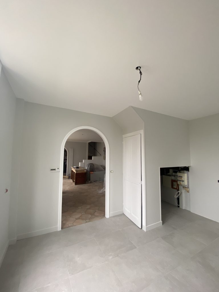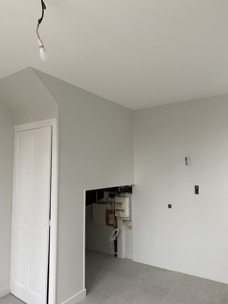 Voici les étapes exécutées dans la rénovation de cette cuisine : commençant par la dépose complète et l’évacuation de l’ancienne cuisine, ainsi que la suppression de la faïence sur les murs. Ensuite, nous avons procédé à la reprise du placo sur un mur beaucoup trop abîmé par la dépose de la faïence, suivi d’une préparation minutieuse de la pièce, comprenant un lissage des murs et un rebouchage de tous les spots au plafond. Nous avons ensuite réalisé un ponçage complet, suivi d’une impression et de deux couches de finition. Pour apporter une touche de couleur à cette cuisine, nous avons opté pour une teinte claire et harmonieuse, tout en redonnant un coup de jeune aux boiseries pour parfaire l’ensemble.