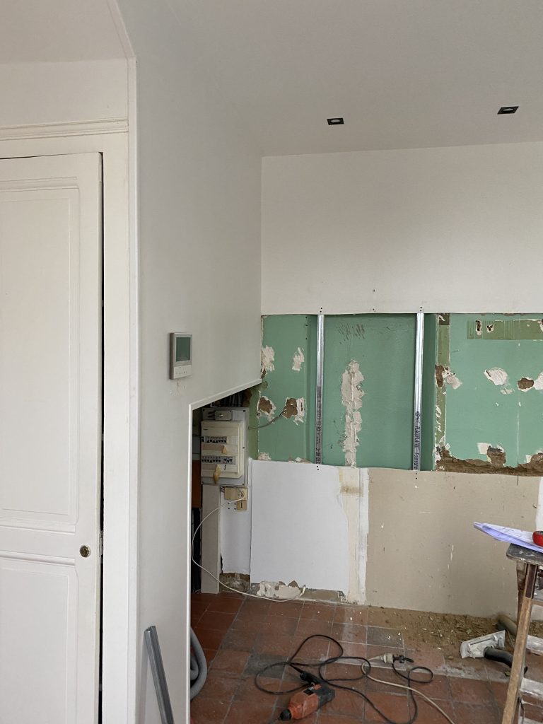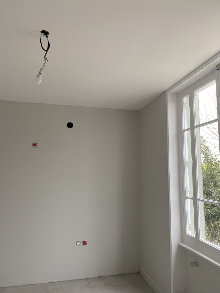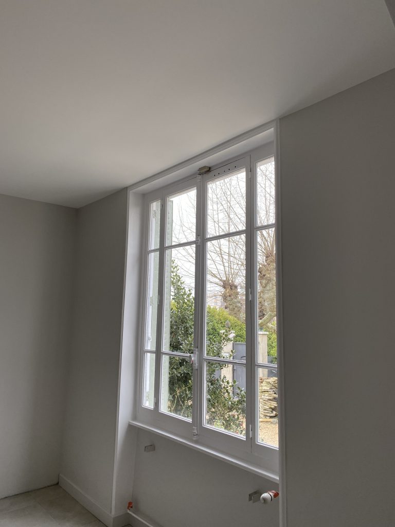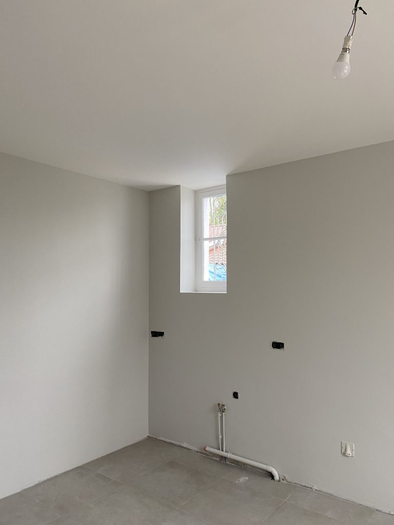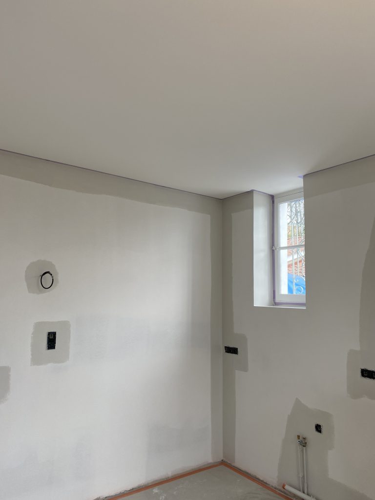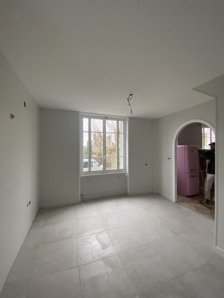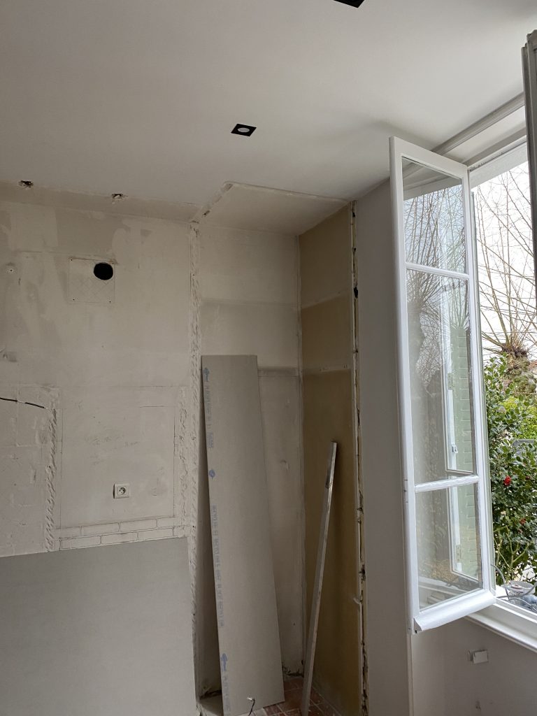 Voici les étapes exécutées dans la rénovation de cette cuisine : commençant par la dépose complète et l’évacuation de l’ancienne cuisine, ainsi que la suppression de la faïence sur les murs. Ensuite, nous avons procédé à la reprise du placo sur un mur beaucoup trop abîmé par la dépose de la faïence, suivi d’une préparation minutieuse de la pièce, comprenant un lissage des murs et un rebouchage de tous les spots au plafond. Nous avons ensuite réalisé un ponçage complet, suivi d’une impression et de deux couches de finition. Pour apporter une touche de couleur à cette cuisine, nous avons opté pour une teinte claire et harmonieuse, tout en redonnant un coup de jeune aux boiseries pour parfaire l’ensemble.