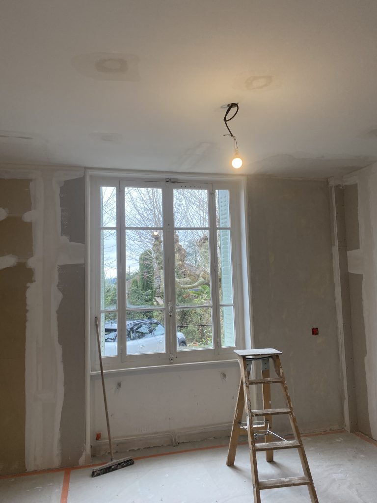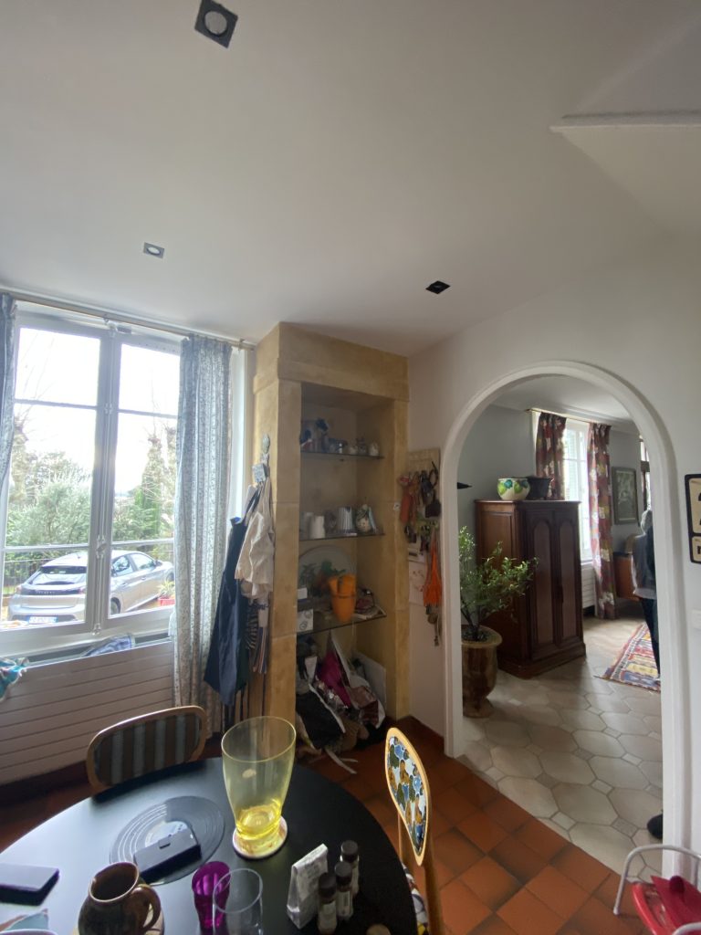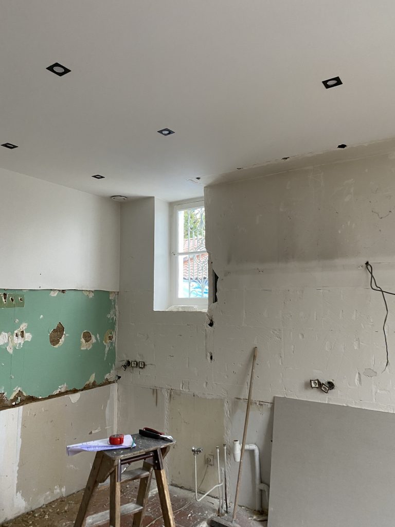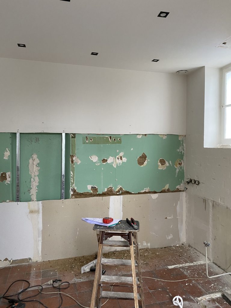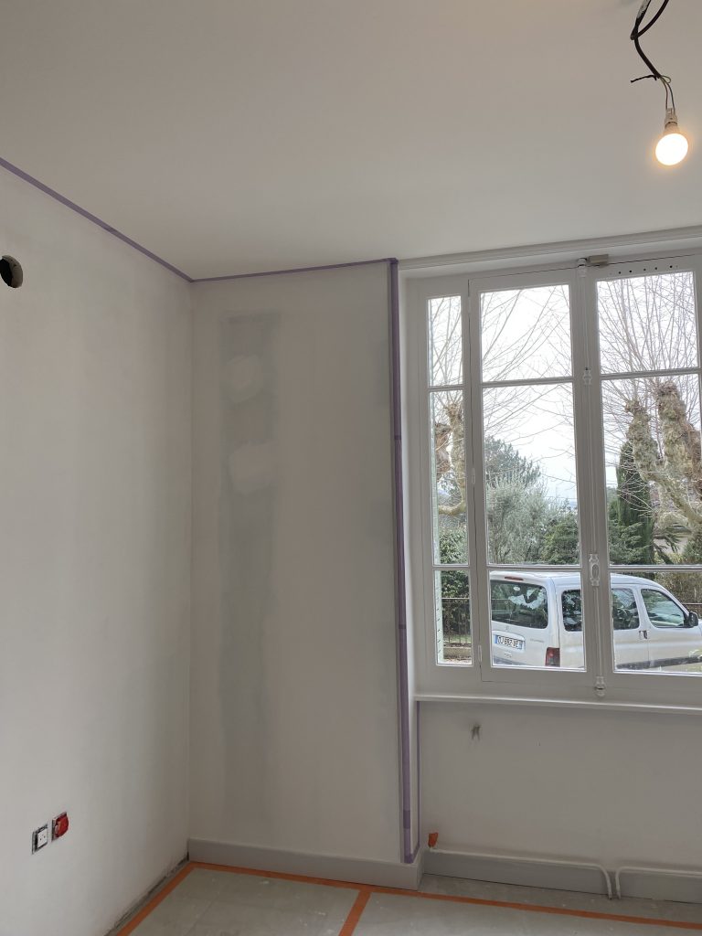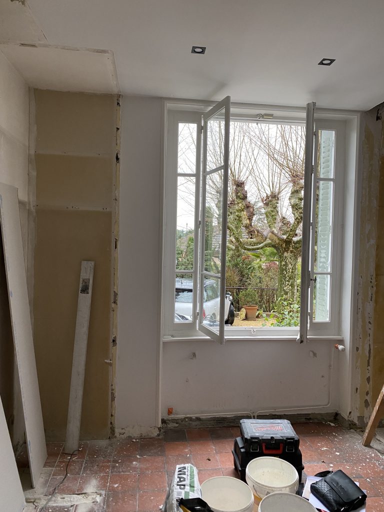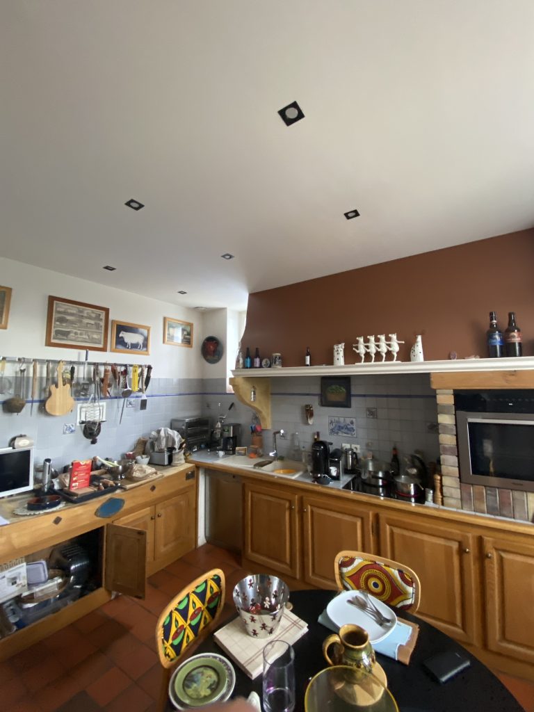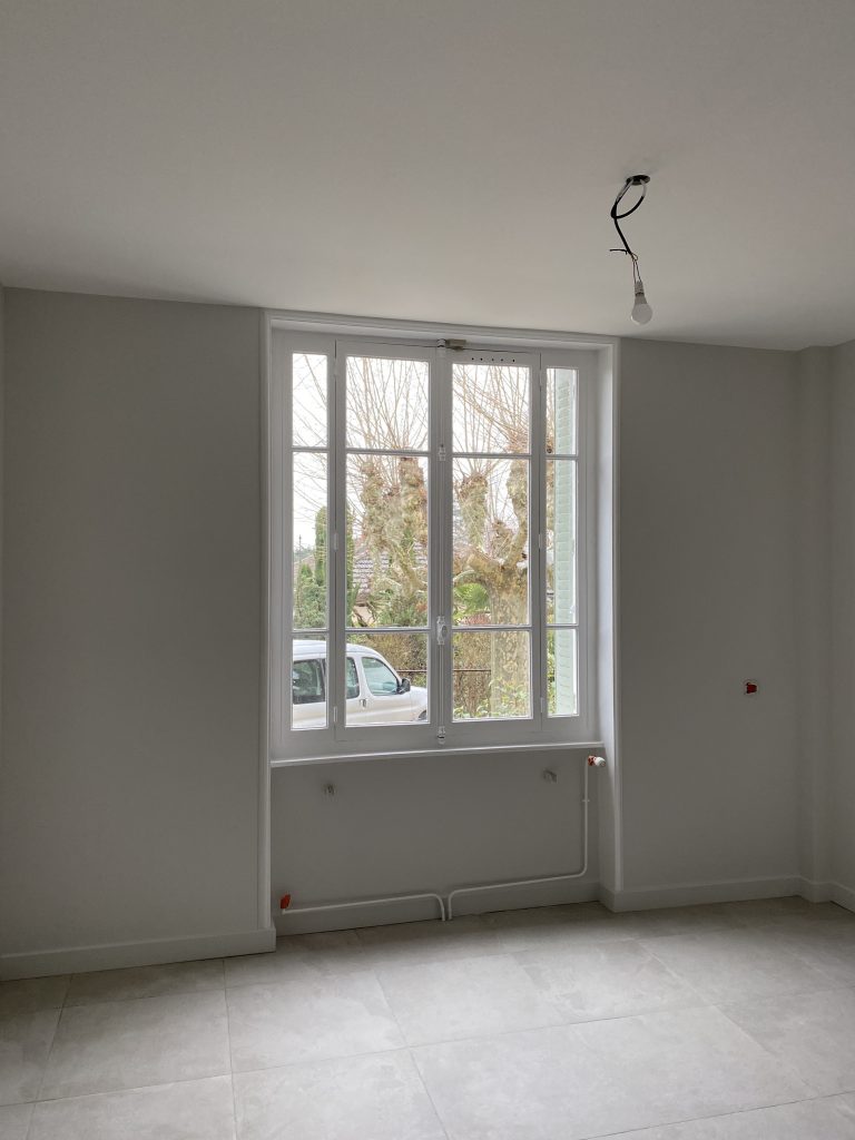 Voici les étapes exécutées dans la rénovation de cette cuisine : commençant par la dépose complète et l’évacuation de l’ancienne cuisine, ainsi que la suppression de la faïence sur les murs. Ensuite, nous avons procédé à la reprise du placo sur un mur beaucoup trop abîmé par la dépose de la faïence, suivi d’une préparation minutieuse de la pièce, comprenant un lissage des murs et un rebouchage de tous les spots au plafond. Nous avons ensuite réalisé un ponçage complet, suivi d’une impression et de deux couches de finition. Pour apporter une touche de couleur à cette cuisine, nous avons opté pour une teinte claire et harmonieuse, tout en redonnant un coup de jeune aux boiseries pour parfaire l’ensemble.